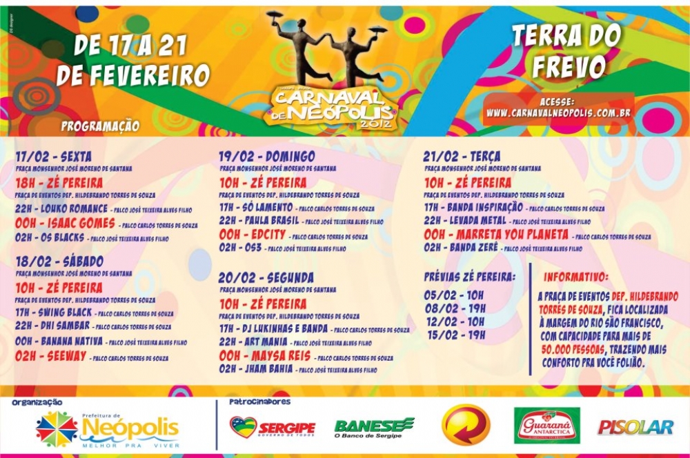 Na programação da festa, haverá o já tradicional frevo, além de bandas de axé e pagode. A intenção, nas palavras do prefeito, é fazer com que o carnaval de Neópolis seja uma alternativa aos que não querem ir para Salvador e nem Recife ou Olinda. “Pela festa passam mais de 100 mil pessoas por dia, essa é uma festa de projeção mundial”, acredita Marcelo Guedes.